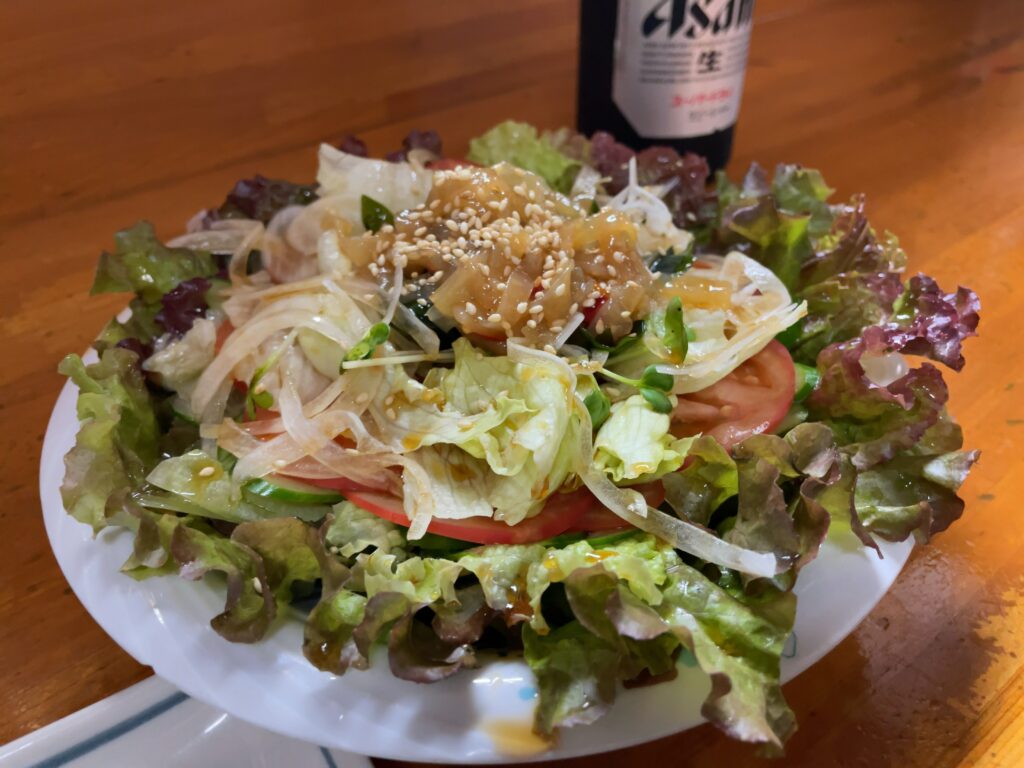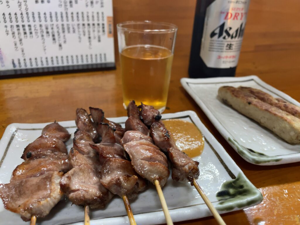 料理は焼き鳥、つくね、そして中華風サラダを頼んだ。これらをまず食べている間に次の注文を考える作戦だったが、サラダの量が異常に多く、これで一発でおなかがいっぱいになってしまった。不覚だった。